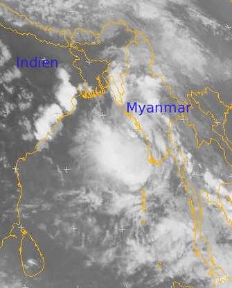 Ein Tief liegt mit seiner Bewölkung vor und über Myanmar (Birma). Auf dem Meer weht dabei auch starker Wind. Die Wolken bringen in Teilen Myanmars heftigen Regen und verschlimmern so die ohnehin schon dramatische Lage. Da das Tief auch die nächste Tagen weiter das Wetter bestimmt, kommt es zu neuerlichen ergiebigen Regenfällen. Mit einer Wetterbesserung ist vorerst nicht zu rechnen, so dass sich die Situation kaum verbessert. (Bildquelle: Copyrigt EUMETSAT, NERC Satellite Receiving Station, University of Dundee)