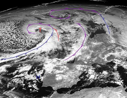 Die Fronten mit der zugehörigen Bewölkung von Tief 'Chanel' liegen heute Mittag westlich vor den Britischen Inseln. Auch von Norddeutschland bis nach Westskandinavien und nach Island erstreckt sich ein Frontensystem mit teils dichten Wolken. Des weiteren befindet sich ein schwacher Ausläufer mit einigen Wolken von den westlichen Britischen Inseln bis nach Westfrankreich. Dieser Ausläufer zieht nach Osten weiter, bringt aber nur wenig Regen und wird von Tief 'Chanel' morgen eingeholt. Mit dem Tief regnet es dann auch in Deutschland häufiger, zudem frischt der Wind dabei deutlich auf. (Bildquelle: Copyrigt EUMETSAT, NERC Satellite Receiving Station, University of Dundee)