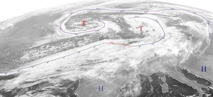 Tief 'Chanel' mit seinen zwei Zentren bei Island und Skandinavien führt heute die Wetterregie in Europa. So ziehen dichte Wolken über Skandinavien und von Polen bis über Nordspanien hinweg. Weitere Ausläufer bringen auch über die nördlichen Britische Inseln viele Wolken. Weniger Wolken findet man dagegen am Mittelmeer. (Bildquelle: Copyrigt EUMETSAT, NERC Satellite Receiving Station, University of Dundee)