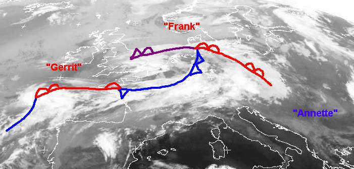 Während es in Nordwesteuropa weiter wechselhaft und teilweise noch kühl bleibt, sorgt Hochdruckeinfluss im Süden und Südosten für viel Sonnenschein und ansteigende Temperaturen. Auf dem Satellitenbild vom Montagmorgen liegt das Tief 'Frank' über dem Ärmelkanal, man erkennt sehr gut sein Frontensystem (die Kaltfront erstreckt sich von Deutschland bis nach Bretagne und ist hier mit dem Frontensystem des neuen Tiefs 'Gerrit' verbunden, die Warmfront liegt über Polen). Auf dem Balkan sorgt das Hoch 'Annette' für fast wolkenlosen Himmel