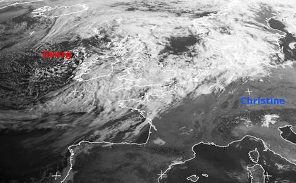 Tief 'Georg' mit seinem Zentrum vor Schottland hat heute morgen mit seinem ersten Ausläufer und dichter Bewölkung den Nordwesten des Kontinentes erfasst. In diesem Bereich kam es zu leichten Niederschlägen. Ein zweiter Ausläufer liegt über Großbritannien und südwestlich auf dem Atlantik hinaus. Dieser Ausläufer bringt in den Abendstunden erneut Regen nach Mitteleuropa und Deutschland und dahinter werden mit einer westlichen Strömung kalte Luft und Schauer herangeführt. (Bildquelle: NERC Satellite Receiving Station, Dundee University, Scotland, http://www.sat.dundee.ac.uk/)
