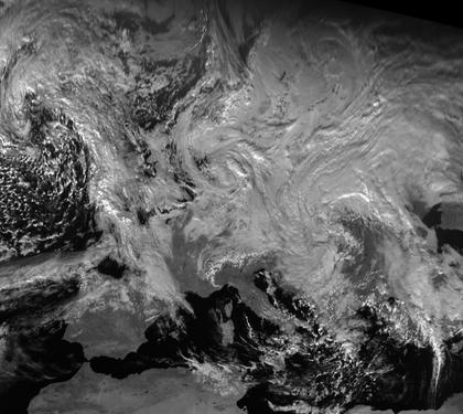 Auf dem Satellitenbild sind bei den Britischen Inseln die Wolken des Tiefs 'Gerhard' erkennbar, das in den nächsten Tagen für das Wetter in Mitteleuropa bestimmend wird. In den wolkenfreien Gebieten der südlichen Alpen sind die großen Alpenseen und die verschneiten Berge sowie die noch schneefreien Täler erkennbar.