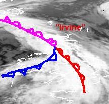 Der Ausschnitt zeigt das Tief 'Irvine' mit Zentrum über Schottland. Das Frontensystem des Tiefs überquert heute Großbritannien und Frankreich mit Schnee, gefrierenden Regen und Regen. Morgen überquert es Deutschland, dabei sind auch hier Schnee, Gefrierender Regen und Regen zu erwarten.