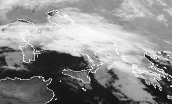 Das Tief 'Karlheinz' über Italien ist als Wellenkamm in dem breiten Wolkenband über dem nördlichen Mittelmeer schon schwach zu erkennen. Die Warmfront erstreckt sich über der Adria, die nachfolgende Kaltfront reicht von Italien über Sardinien bis nach Frankreich. Im Laufe des Tages wird es über der Adria und Italien zu ergiebigen Niederschlägen kommen.