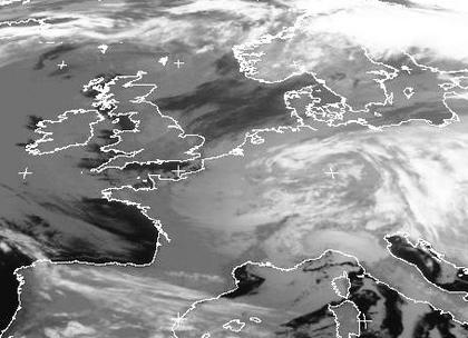 Über Deutschland erkennt man die Bewölkung des kleinen Tiefs 'Liesbeth', das vor allem im Westen Schnee brachte. Es zieht nun weiter nach Südwesten und löst sich langsam auf. Dann gelangt Deutschland wie schon weite Teile Westeuropas unter Hochdruckeinfluss. Man erkennt über den Britischen Inseln und Westfrankreich bis auf verbreiteten Hochnebel keine höheren Wolken.