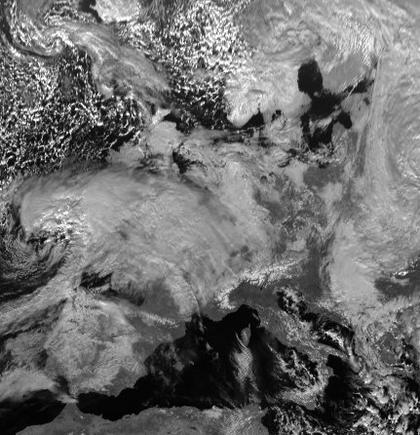 Über Deutschland liegt am Montagmittag noch die Bewölkung eines abgeschwächten Tiefausläufers. Dabei nähert sich vom Atlantik her schon das Sturmtief 'Quinten'. Das Zentrum des Wirbels liegt am linken Bildrand, westlich der Bretagne. Das Tief zieht am Dienstag mit kräftigem Wind, Regen und Schnee über Deutschland hinweg.