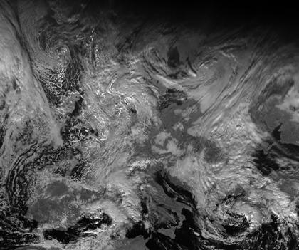 Auf dem Satellitenbild von Europa ist über dem östlichen Nordatlantik das Tief 'Quintus' an der spiralförmigen Wolkenstruktur und an den typischen Wolken der Warm- und Kaltluftbereiche zu erkennen. Sein Frontensystem reicht bis Mitteleuropa, wo sich in diesem Bereich einige Randtiefs entwickelt haben.