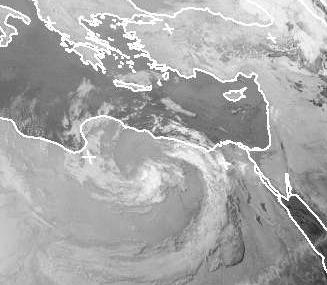 Auf dem Satellitenbild von Sonntag früh ist ein Tief mit seiner Wolkenspirale gut zu erkennen. Dieses Tief sorgt heute in Libyen und Ägypten örtlich für Schauer und Gewitter. (Bildquelle: NERC Satellite Receiving Station, Dundee University, Scotland, http://www.sat.dundee.ac.uk/)