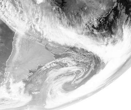 Auf dem Satellitenbild von Sonntag früh ist ein Tief auf dem Südatlantik nahe der Argentinischen Küste gut zu erkennen. Seine Ausläufer reichen bis in den Norden von Argentinien und Südbrasilien und sorgen hier gebietsweise für Regen. (Bildquelle: NERC Satellite Receiving Station, Dundee University, Scotland, http://www.sat.dundee.ac.uk/)