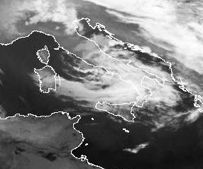 Der Ausschnitt zeigt ein kleines Tief über Süditalien. Es sorgt hier heute für kräftige Schauer, zum Teil auch mit Gewittern. Auch muss, besonders auf seiner Südseite, mit stürmischem Wind gerechnet werden.