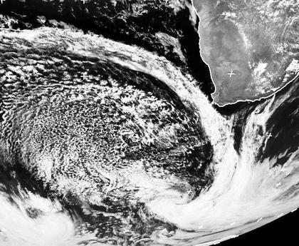 Zwischen Südafrika und der Antarktis liegt ein ausgedehnter Tiefdruckwirbel. Das Wolkenband seiner Kaltfront zieht langsam weiter nach Osten nach Südafrika. Dahinter ist kalte Luft weit nach Norden geströmt. Man erkennt das lockere Muster der dort entstandenen Schauer. (Bildquelle: NERC Satellite Receiving Station, Dundee University, Scotland, http://www.sat.dundee.ac.uk/)