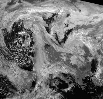 Bei Irland liegt der Kern des Sturmtiefs 'Yannick'. In den zentralen Bereichen des Tiefs findet man eher lockere Bewölkung. Das dichte Wolkenband seines Frontensystems liegt über Großbritannien und Frankreich. Auf seiner Vorderseite war es in Deutschland am Mittwoch meist gering bewölkt, gebietsweise, vor allem im Norden und Osten, zog aber auch dichte hochnebelartige Bewölkung durch.