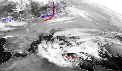 Nur Schwach sind die Ausläufer von Nordmeertief 'Bert' über Norddeutschland zu erkennen. Sie sorgen heute für Regen, örtlich auch Schnee, auf ihrer Rückseite lockern die Wolken etwas auf. Von Portugal über Frankreich bis nach Großbritannien sorgt Hoch 'Birte' für ruhiges Wetter, gebietsweise halten sich aber Nebel- oder Hochnebelfelder. Das Höhentief 'Zeo' bleibt weiterhin wetterbestimmend von Süditalien bis nach Nordafrika und verstärkt sich wieder etwas. Vor allem in Sizilien und Tunesien bringt es heute zum Teil kräftigen Regen, örtlich auch Gewitter, und Wind.