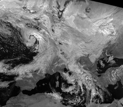 Auf dem Satellitenbild ist sehr gut die spiralförmige Struktur von Tief 'Zephyr' mit Zentrum über Schottland erkennbar. Die Ausläufer von 'Zephyr' sorgen morgen für Regen in weiten Teilen Deutschlands.