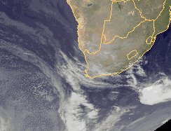 Über dem südlichen Afrika findet man derzeit meist nur wenige Wolken. Je weiter man in den Süden schaut, desto mehr ziehen jedoch die Wolkenfelder von Tiefausläufern durch. Auch heute nähert sich der Ausläufer eines Tiefs über dem Südpolarmeer von Westen dem Kapland.