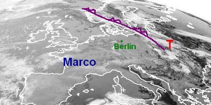 In weiten Teilen Mittel- und Osteuropas sorgt Tiefdruckeinfluss für viele Wolken und Schauer. Auch in Skandinavien und auf den Britischen Inseln ist es wolkenreich. Nur in Spanien, Frankreich und Italien kann sich Hoch „Marco“ langsam durchsetzen mit freundlichem Wetter. (Bildquelle: NERC Satellite Receiving Station, Dundee University, Scotland, http://www.sat.dundee.ac.uk/)