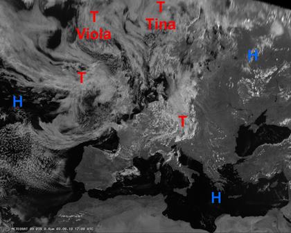 Auf dem heutigen Satellitenbild sind Tiefdruckgebiete von Großbritannien bis nach Skandinavien und ein weiteres kräftiges Tief mit Zentrum über Polen zu erkennen. Hierbei kommt es wiederholt zu teils kräftigen Schauern oder Gewittern. Unter Hochdruckeinfluss freundlicher und meist trocken ist es sowohl in Süd- als auch in Osteuropa, dabei ist es allerdings gebietsweise auch sehr heiss.