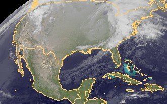 Das Satellitenfoto von heute zeigt Mexiko und weite Teile der USA überwiegend wolkenlos. Kräftige und ausgeprägte Tiefdrucksysteme sorgen aber sowohl im Nordwesten als auch in weiten Teilen des Ostens der USA für vielfach dichte Wolken und teils andauernden Regen, im Nordosten der USA fällt dabei überwiegend Schnee.