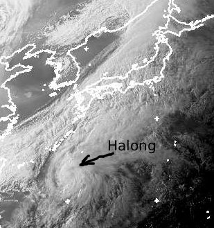 Der tropische Sturm 'Halong' liegt am Montag südöstlich von Okinawa auf dem Pazifischen Ozean. Er erreicht in Böen bis zu 130 km/h. Er zieht weiter nach Nordosten und streift am Dienstag die japanische Küste. Dabei ist in Japan auch mit sehr ergiebigen Regenfällen zu rechnen. (Bildquelle: NERC Satellite Receiving Station, Dundee University, Scotland, http://www.sat.dundee.ac.uk/)