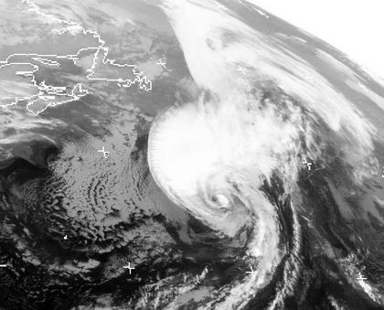 Der tropische Sturm 'Helene' auf dem Nordatlantik wandelt sich allmählich in ein außertropisches Tiefdruckgebiet um. Während man noch die Überreste eines Auges erkennen kann, hat sich der nördliche Arm bereis in der Form einer klassischen Warmfront mit einem weit ausragenden Wolkenschirm entwickelt. Auf der Ostseite des Sturms strömt in niedrigeren Luftschichten deutlich kühlere Luft heran, gut zu erkennen an den niedrigen, relativ dunklen, Stratocumulusfeldern. Der südliche Arm nimmt jetzt die Form einer schwachen Kaltfront an.