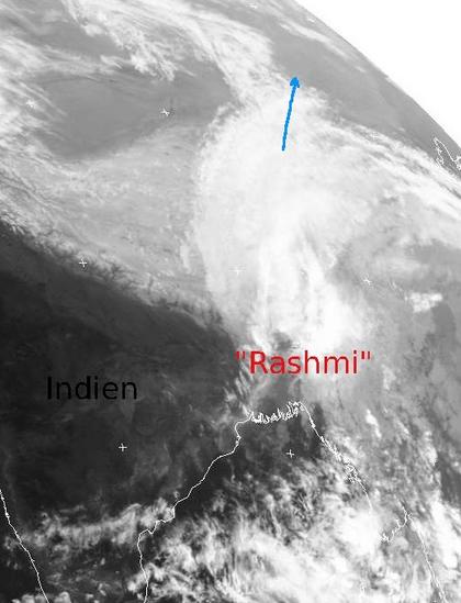 Der ehemalige Zyklon 'Rashmi' ist aus den Golf von Bengalen über Bangladesh ins Hochland von Tibet gezogen. Westlich der Regenwolken sind die Berge an ihrer hellen Färbung im Bild gut sichtbar. Während der Wind nur noch 65 km/h im Mittel und 85 km/h in Böen erreicht, regnet es teils noch kräftig. Davon betroffen ist heute vor allem das Königreich Bhutan. 'Rashmi' wird sich nun weiter abschwächen und vermutlich bald auflösen. (Bildquelle: Copyrigt EUMETSAT, NERC Satellite Receiving Station, University of Dundee)