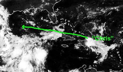 In der Karibik hat sich ein tropischer Sturm (Chris) entwickelt. Zur Zeit befindet er sich etwas nördlich der Dominikanischen Republik und erreicht mittlere Windgeschwindigkeiten von 65, in Böen 84 km/h. Berechnungen zufolge soll er in den nächsten Tagen über Nordkuba weiter in den Golf von Mexiko ziehen und sich hier noch etwas verstärken. Sein Endziel ist noch unklar.