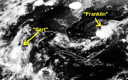 Der tropische Sturm 'Franklin' hat sich vor drei Tagen in der nähe von den Bahamainseln aufgebaut, zur Zeit liegt er über dem westlichen Atlantik und bewegt sich unter Abschwächung nordostwärts, dabei überquert er keine bewohnte Insel.