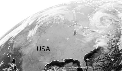 Weite Teile der USA präsentieren sich heute nahezu wolkenlos. Weiter nach Norden zeigt sich dagegen mehr Bewölkung, die auch den äußersten Nordwesten der USA streift. Zudem findet man im Nordosten dichtere Wolken, die zu einem alten Tief gehören und langsam abziehen. Damit bleibt es morgen in fast den gesamten USA niederschlagsfrei. (Bildquelle: Copyrigt EUMETSAT, NERC Satellite Receiving Station, University of Dundee)