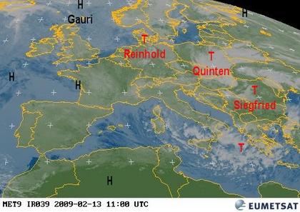 Auf dem Satellitenfoto von heute Mittag zeigen sich eine Reihe von Tiefdruckgebieten von Mitteleuropa bis weit in den Osten Europas hinein. In diesen Gebieten zeigt sich kaum die Sonne und es fällt immer wieder etwas Regen oder Schnee. Ebenso eher unfreundlich mit zahlreichen Schauern, teils auch Gewittern, ist es im zentralen bis östlichen Mittelmeerraum. Etwas freundlicher mit meist nur wechselnder oder auch nur leichter Bewölkung ist es dagegen auf der Iberischen Halbinsel und im westlichen Mittelmeer, hier bleibt es auch meist trocken.