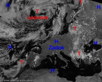 Das heutige Satellitenbild zeigt, dass das Hoch 'Zadok' über Mitteleuropa verbreitet für wolkenloses oder zumindest für heiteres und trockenes Wetter sorgt. Einige kleine Tiefdrucksysteme westlich von Portugal und auf dem Balkan sorgen dort für einzelne Schauer oder Gewitter. Ein ausgeprägteres Tief über dem Nordmeer bringt vor allem in Irland und Schottland dichte Wolken und einige Schauer.