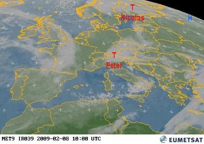 Auf dem Satellitenfoto von heute Vormittag zeigt sich Europa verbreitet mehr oder weniger stark bewölkt, dabei fällt besonders in den Bereichen um die beiden Tiefdruckgebiete 'Peter' über den Alpen und 'Nicolas' über der Ostsee zeitweise Regen. Insgesamt etwas freundlicher, mit vielfach auch längeren sonnigen Abschnitten, ist es insgesamt im westlichen und östlichen Mittelmeerraum.