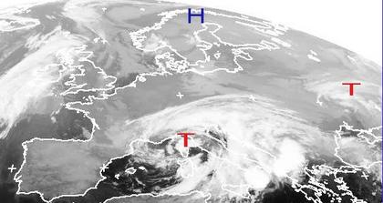 Auf dem heutigen Satellitenfoto zeigt sich ein ausgeprägtes Tief mit dem Kern über Norditalien. Besonders im Süden Italiens kommt es dabei zu teils länger andauernden und ergiebigen Niederschlägen. Ebenso stark bewölkt bis bedeckt ist es in Irland, hier kommt es ebenfalls zu teils länger andauernden Niederschlägen. Im Großraum Europas ist es dagegen meist freundlich und trocken.