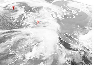 Tief 'Hans' bei Island und Tief 'Joris' über dem Englischen Kanal sorgen mit ihren Ausläufern für dichte Wolken und teils kräftigen Regen, im Norden auch Schnee, von Südskandinavien über Deutschland bis ins Mittelmeer. Weiter im Osten bringt leichter Zwischenhocheinfluss teils noch freundliches und trockenes Wetter. (Bildquelle: NERC Satellite Receiving Station, Dundee University, Scotland, http://www.sat.dundee.ac.uk/)