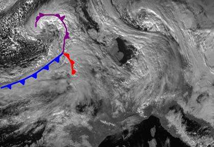 Während ein Ausläufer von Tief 'Quintus' bei Island heute in Deutschland für Wolken und Regen sorgt, zieht auf dem Atlantik aus Westen das neue Tief 'Ronny' heran. Seine Fronten sind auf dem Satellitenbild von Samstag Mittag gut zu erkennen. Auch dieses Tief sorgt in seinem Einflussbereich für Regen.