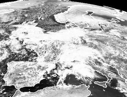 Ein Bereich mehrerer kleiner Tiefdruckgebiete erstreckt sich vom westlichen Mittelmeer bis nach Südskandinavien. Entsprechend ungeordnet präsentiert sich das Wolkenbild. Über Norddeutschland liegt die dichte Regenbewökung von Tief 'Desiree', weiter südlich gibt es Auflockerungen aber auch verstreute Schauer und Gewitterbewölkung. (Bildquelle: NERC Satellite Receiving Station, Dundee University, Scotland, http://www.sat.dundee.ac.uk/)
