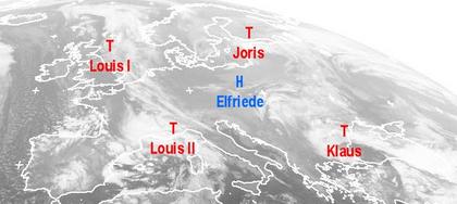 Auf dem Satellitenfoto von heute Morgen zeigt sich Europa durch den Einfluss einiger Tiefdruckgebiete häufig bewölkt oder bedeckt. Besonders Tief 'Louis II' an der südfranzösischen Küste sorgt für teils kräftigen Regen und teils auch noch sehr frischen Wind. Etwas ruhiger bei meist nur leichtem Regen oder Schnee verhält es sich bei Tief 'Louis I' bei den Britischen Inseln und Tief 'Joris' im Bereich der Ostsee. Zudem ist es in Südosteuropa, und hier besonders um das Schwarze Meer herum, vielfach bedeckt und es regnet häufig. In Mitteleuropa und in Teilen Osteuropas ist es dagegen dank Hoch 'Elfriede' überwiegend trocken, aber vielfach hochnebelartig bewölkt, teils kann sich die Sonne aber durchsetzen.
