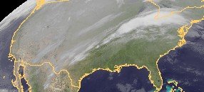 Das heutige Satellitenfoto zeigt ein ausgeprägtes Wolkenband im Nordosten der USA, hierbei kommt es vielfach zu kräftigem Regen, auf der Nordseite teils auch zu kräftigen Schneefällen.
