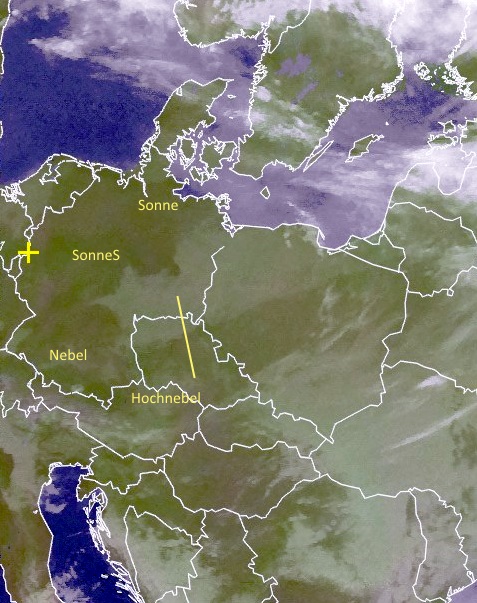 Nur wenige Nebelfelder zeigten sich an der Donau auf dem Satellitenbild am Mittag. Auch der Hochnebel über Ostdeutschland (besonders Brandenburg und Sachsen) war noch gut zu erkennen. 80 % des gesamten Landes waren in der Sonne am Nachmittag gut zu erkennen. So wurde es zum Teil mit 7 Grad C mild.