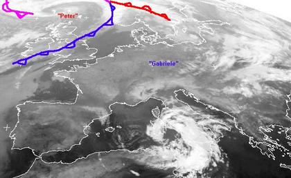 Währen die Kaltfront des Tiefs 'Peter' nördlich von Schottland in Großbritannien heute teilweise für Schauer sorgt, bringt eine Hochdruckbrücke von den Azoren bis nach Polen für einen fast Wolkefreien Himmel. Lediglich im dem Mittelmeer sorgt ein Tief noch für Schauer und Gewitter, vor allem in Korsika und auf Sizilien.