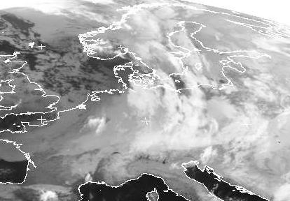 Über Skandinavien und Deutschland liegt ein faseriges Band aus hellen, hohen Wolken. Es gehört zu einer Warmfront, die sich langsam von West nach Ost über Nord- und Mitteleuropa schiebt. Dort, wo die warme Luft auf die tiefer liegende Kaltluft aufgleitet, bilden sich in der aufsteigenden Luftmasse diese Wolkenfelder. Innerhalb der Warmfront strömt die Luft von Nord nach Süd, sodass sich die Wolken weiterhin am Alpenrand stauen. Auch in tieferen Luftschichten halten sich weiterhin teils dichte Wolken, die auf diesem Bild in einem etwas dunkleren Grauton erscheinen.