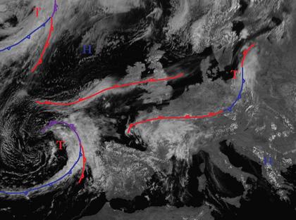Tief 'Bringfried' liegt mit seinen Ausläufer und Wolken heute Mittag vom Baltikum bis nach Nordfrankreich. An dieser Luftmassengrenze entwickeln sich Schauer und Gewitter. Weiter nach Norden liegt noch ein Restausläufer von Tief 'Adheld' über Skandinavien. Die meisten Wolken finden sich aber von Südfrankreich bis zum Tief 'Cornelia' auf Atlantik westlich vor der Iberischen Halbinsel. Weniger Wolken bringt Hochdruckeinfluss dagegen von Nordfrankreich bis Norddeutschland und in Südosteuropa.