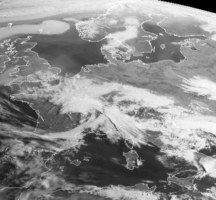 Hoch 'Paul' schwächt sich etwas ab, verlagert seinen Einflussbereich aber zugleich etwas weiter nach Süden, sodass in weiten Teilen Deutschlands die Sonne von einem, wenigstens am Morgen, wolkenlosen Himmel scheint. Im Süden und Südwesten des Landes erkennt man aber auch noch dichte Wolken. Sie gehören zu einem Gebiet tieferen Luftdrucks, das von den Britischen Inseln bis auf den Balkan reicht. Auch in diesen Gebieten liegen noch Wolken, die zum Teil noch Schauer und Gewitter bringen. Interessant ist auch ein Gebiet mit Wolken im östlichen Schweden, die sich in etwas feuchterer Luft dort gebildet haben. Die feuchte Luft zieht langsam südwestwärts. (Bildquelle: NERC Satellite Receiving Station, Dundee University, Scotland, http://www.sat.dundee.ac.uk/)