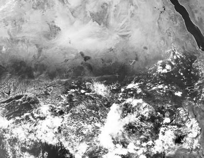 Weite Teile der Sahara zeigen sich am Freitag Mittag wolkenlos. Die hellen Flächen kennzeichnen Sandflächen. Weiter nach Süden wird die Landoberfläche dunkler, hier beginnt der Regenwald. Während im Nordsommer die Innertropischen Konvergenzzone (ITZ) mit Schauer und Gewitter bis an den grünen Rand reicht, ist sie nun schon etwas nach Süden verlagert. Ziemlich scharf kann man eine Grenze ausmachen, wo die Bewölkung und damit die Schauer und Gewitter und die ITZ anfangen. (Bildquelle: NERC Satellite Receiving Station, Dundee University, Scotland, http://www.sat.dundee.ac.uk/)