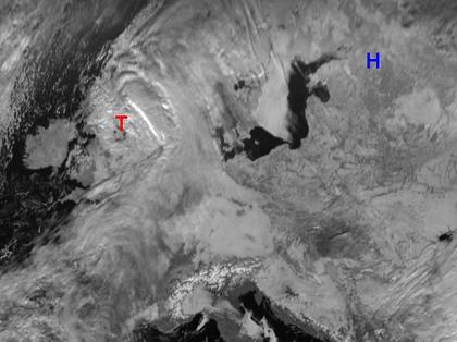 Das Hoch 'Dirk' über Russland sorgt in der Osthälfte von Europa für freundliches, aber auch kaltes Winterwetter. Auf dem Satellitenbild von Samstag Mittag sind bei einem fast wolkenfreien Himmel die Alpen, sowie die Umrisse der Ostsee gut zu erkennen. Weiter westlich bringen die Ausläufer eines Tiefs über den Britischen Inseln dagegen dichte Wolken mit Schnee, im Süden auch Regen. Morgen gelangt auch Deutschland unter den Einfluss dieses Tiefs.