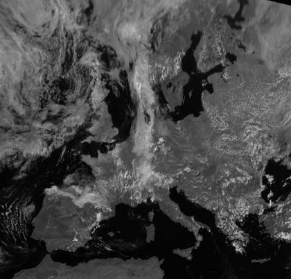 Über weiten Teilen Osteuropas ebenso wie in England und Nordfrankreich bilden sich unter Hochdruckeinfluss meist nur einige lockere Quellwolken und es ist weitgehend trocken. Von Südnorwegen über Westdeutschland bis zur Schweiz erstreckt sich jedoch ein Wolkenband. Hier liegt in einem Bereich tieferen Luftdrucks eine Luftmassengrenze, die warme Luft im Osten von etwas kühlerer im Westen trennt. Das Wolkenband verlagert sich nur langsam etwas ostwärts. Dabei bilden sich jedoch teils noch einige Gewitter, vor allem auf seiner Ostseite. Eine erste aufquellende Zelle ist am Harz zu erkennen.
