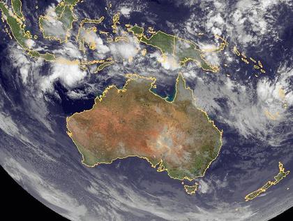 Über dem gesamten australischen Kontinent sind aktuell kaum Wolken zu erkennen. Unter dem Einfluss der subtropischen Sonne wird es dabei vor allem im Landesinneren sehr warm. Im Gegensatz dazu fallen über Papua-Neuguinea starke Schauer, die tropischen Charakter haben.
