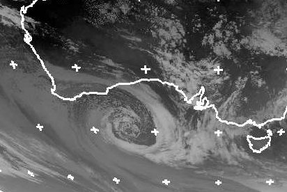 Vor der Südwestküste Australiens liegt ein Tiefdruckwirbel in einem sehr fortgeschrittenem Stadium. Es hat sich bereits 'eingekringelt' und weist die Form einer Spirale auf. Während es vor der Küste teilweise stark regnete, kam der Niederschlag fast nicht an Land, so dass es hier kaum regnete. (Bildquelle: NERC Satellite Receiving Station, Dundee University, Scotland, http://www.sat.dundee.ac.uk/)
