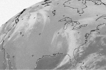 Über Nordamerika erkennt man zwei Tiefsruckgebiete mit ihren Wolken: Eines im Westen und eines im Osten. Sie bringen beide örtlich kräftige Regenfälle oder auch Schneefälle.