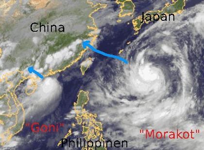 Gleich zwei Tropenstürme liegen vor der Küste Chinas im nordwestlichen Pazifik. Dabei hat 'Goni' mit Windgeschwindigkeiten von 75 km/h im Mittel (90 km/h in Böen) fast schon die Landfläche nördlich der Insel Hanoi erreicht. 'Morakot' dagegen, der einen viel größeren Umfang aufweist, liegt noch weiter weg von der Küste. Er erreicht 90 km/h im Mittel (140 km/h in Böen) und verstärkt sich weiter. Voraussichtlich am Samstag trifft er dann auf die Küste.
