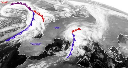 Auf dem Satellitenbild von Sonntag früh sind zwei Tiefdruckgebiete gut zu erkennen. Tief 'Kurt' zieht heute mit seinen Fronten über Großbritannien hinweg und sorgt dort für zum Teil kräftigen Regen. Vom Mittelmeer bis nach Süddeutschland bringt ein kleines Tief über den Alpen ebenfalls teils kräftige Niederschläge. Zwischen diesen Tiefdruckgebieten sorgen Hoch 'Ute' und Hoch 'Verena' für freundliches Wetter und einen fast wolkenfreien Himmel von Spanien bis zur Ostsee.